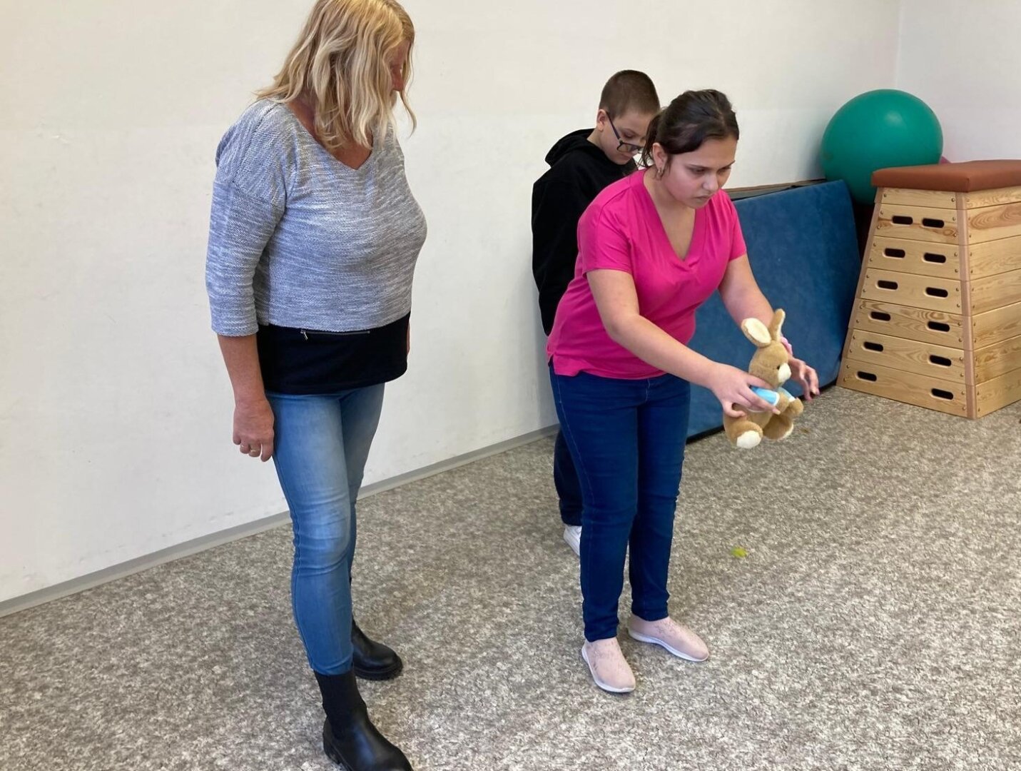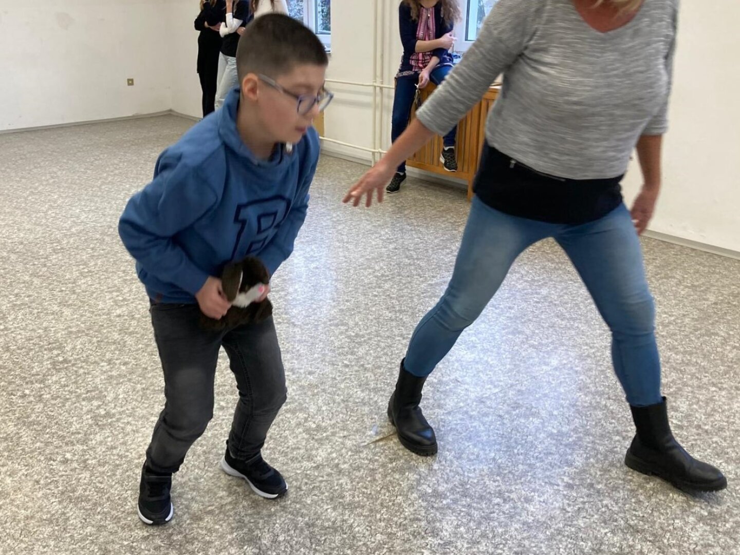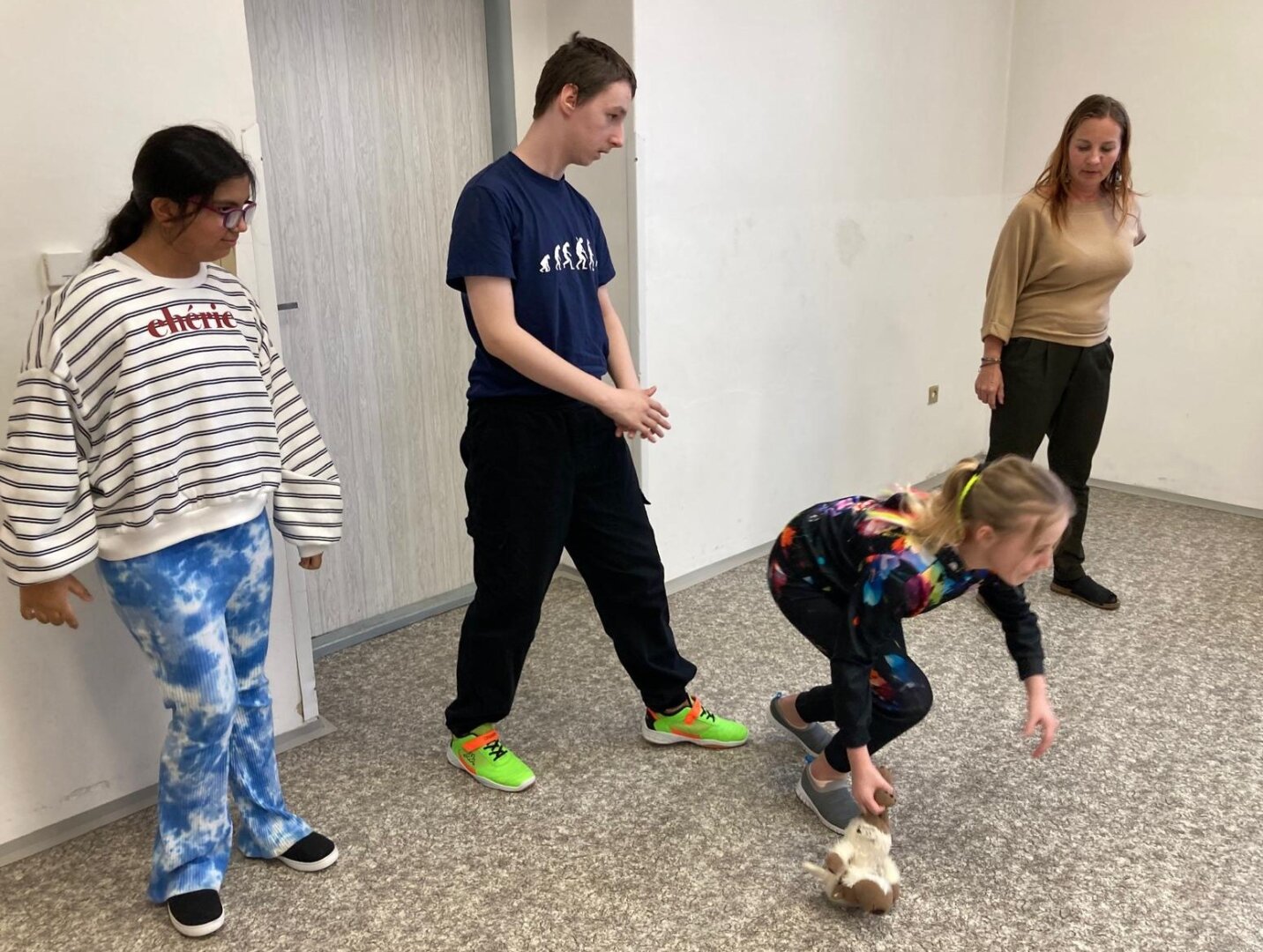 Co je pro tento vzdálený kontinent nejtypičtější? Klokani. A co dělají klokani? Skáčou... Děti se nejprve při hře na molekuly rozdělily do trojic. Každá trojice žáků si vybrala svého malého klokana, kterého si předávali místo štafetového kolíku. A pak už mohli začít poměřovat své síly. Každý ze skupinky skočil 5 skoků a vyhrála skupina, která takto doskákala nejdále.