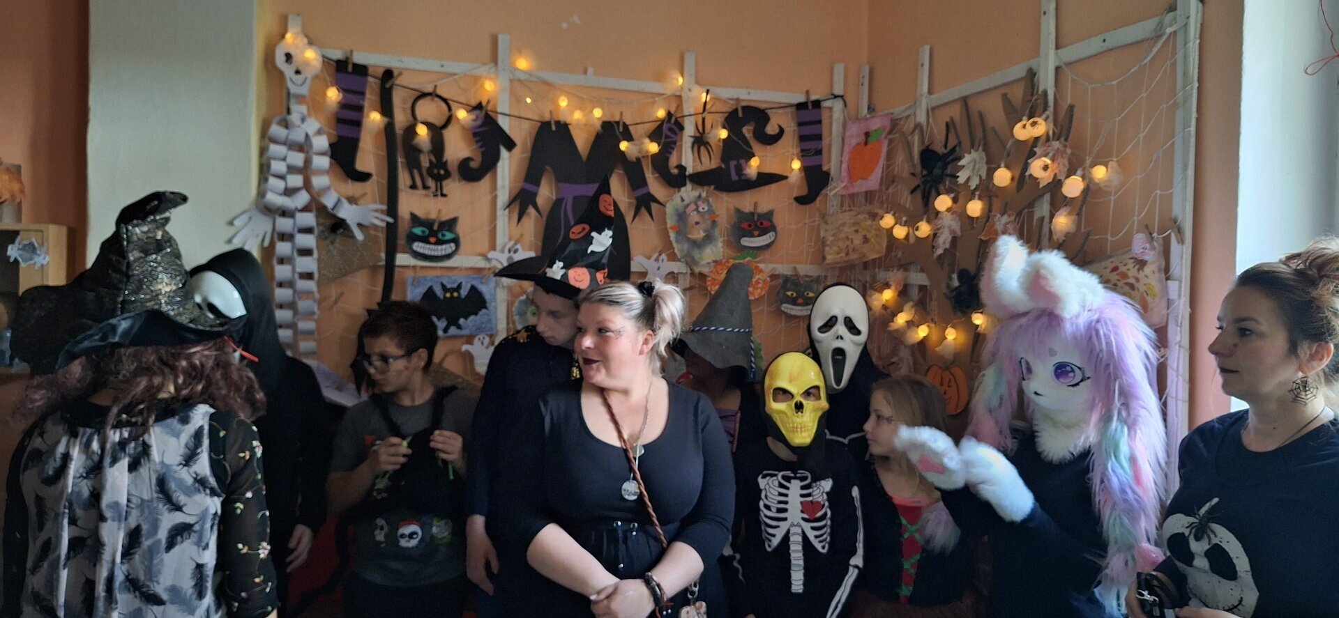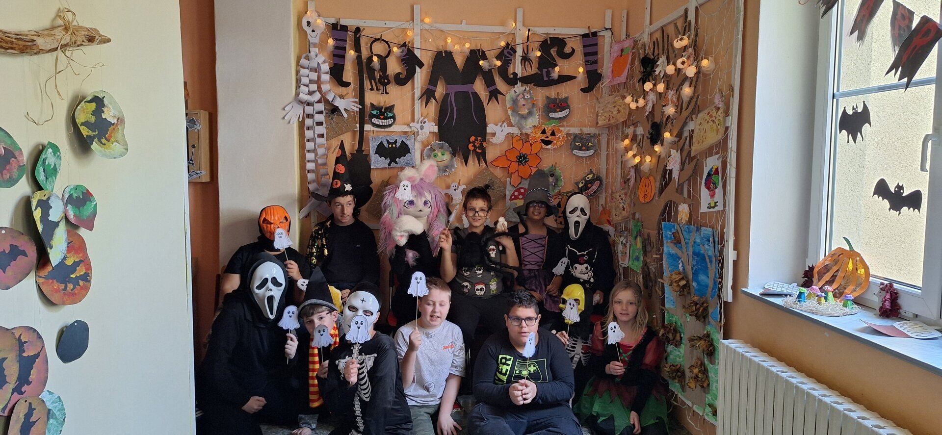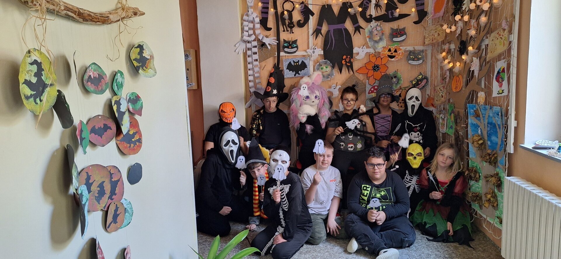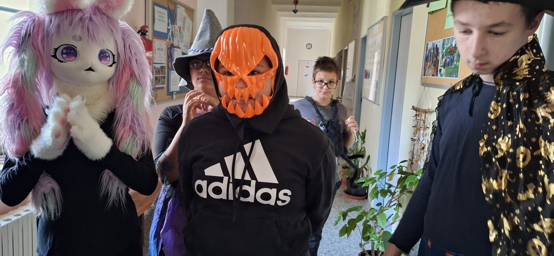 V pátek 31. října se v naší škole objevily masky čarodějnic, filmových postav a rozzlobených dýní. Na chodbě blikala světýlka a atmosféru dokreslovala strašidelná výzdoba na oknech.