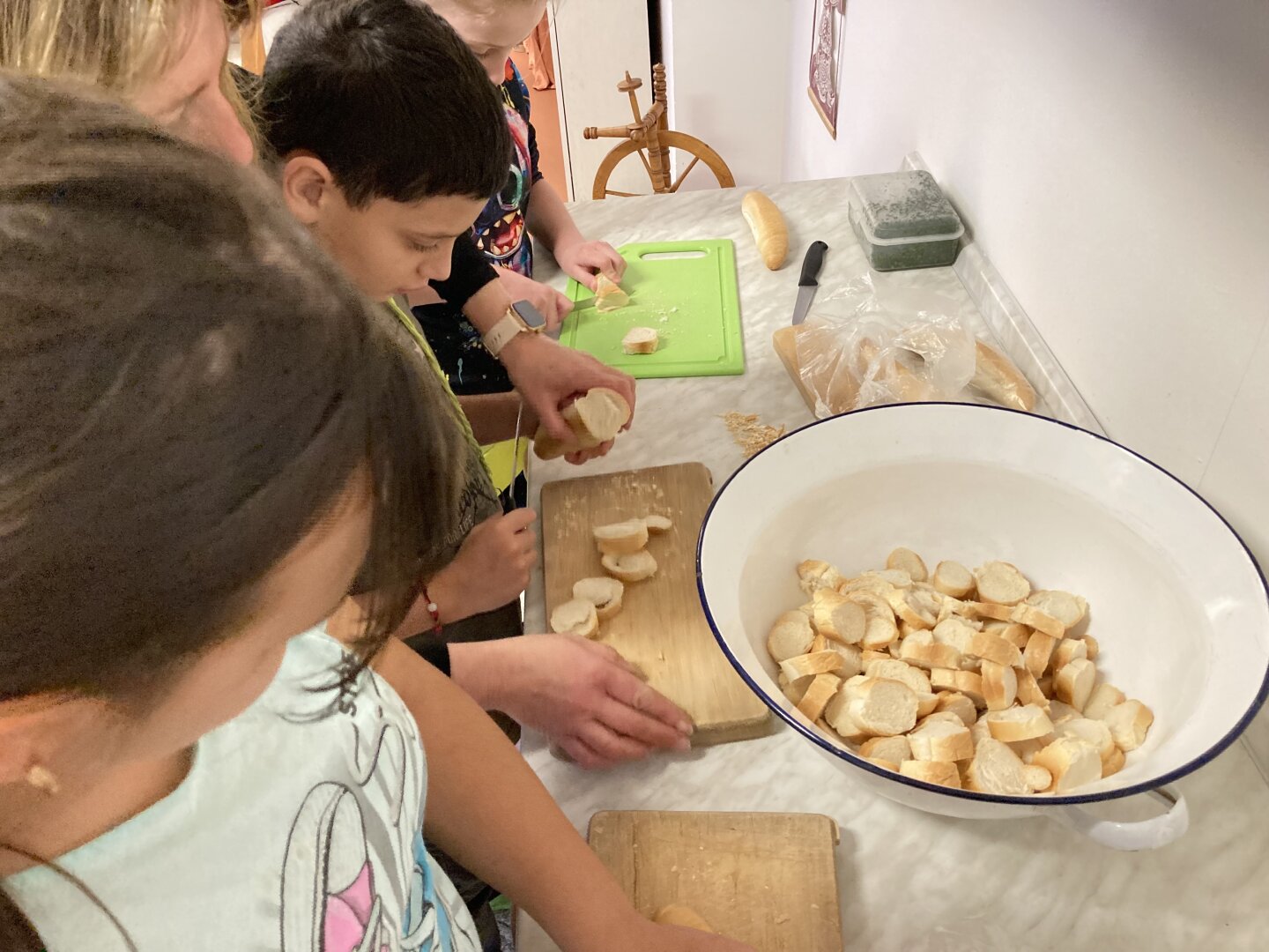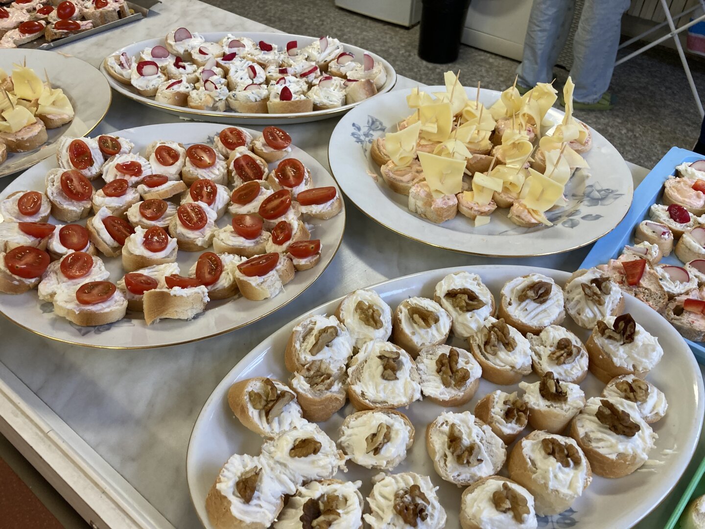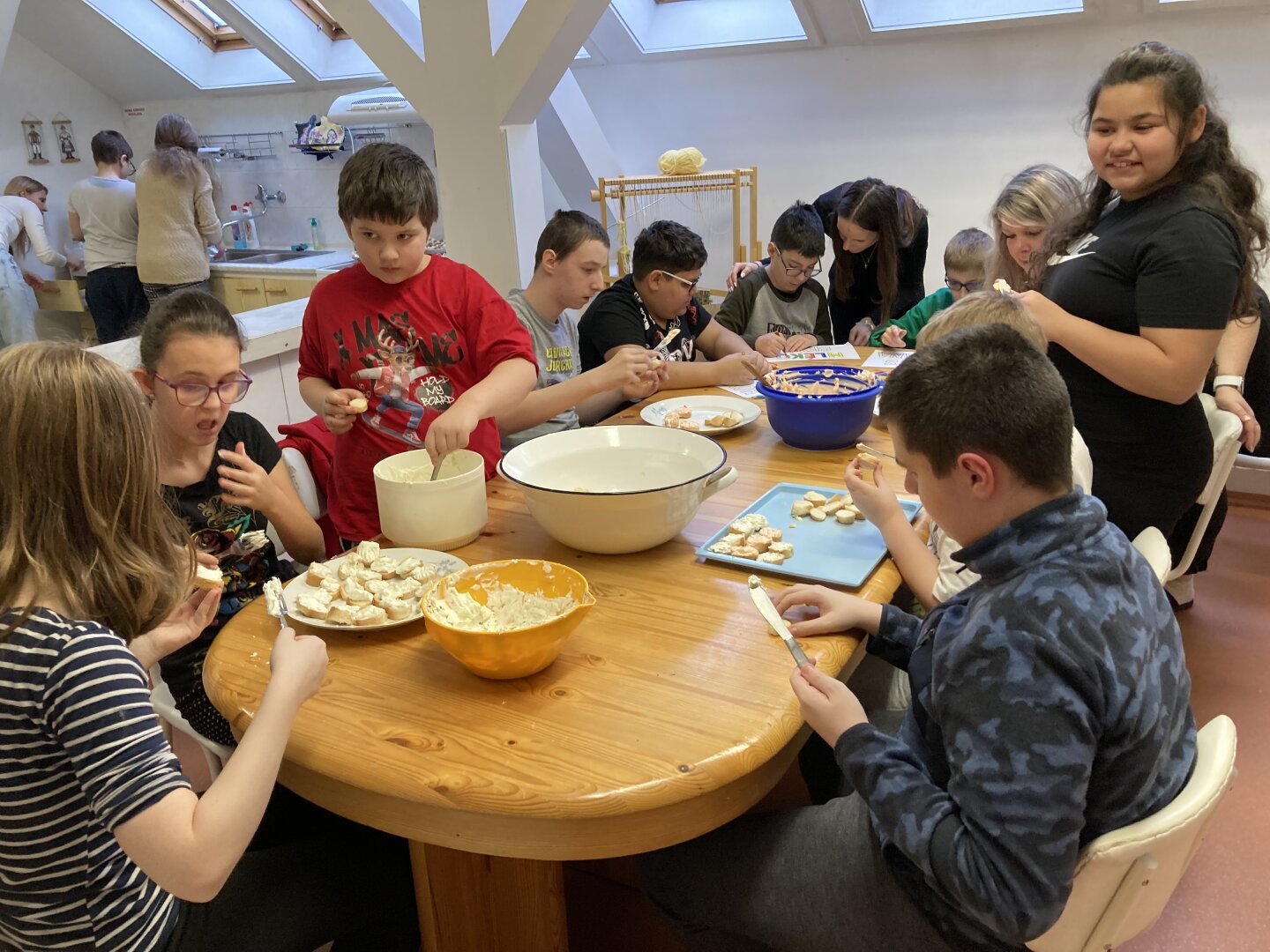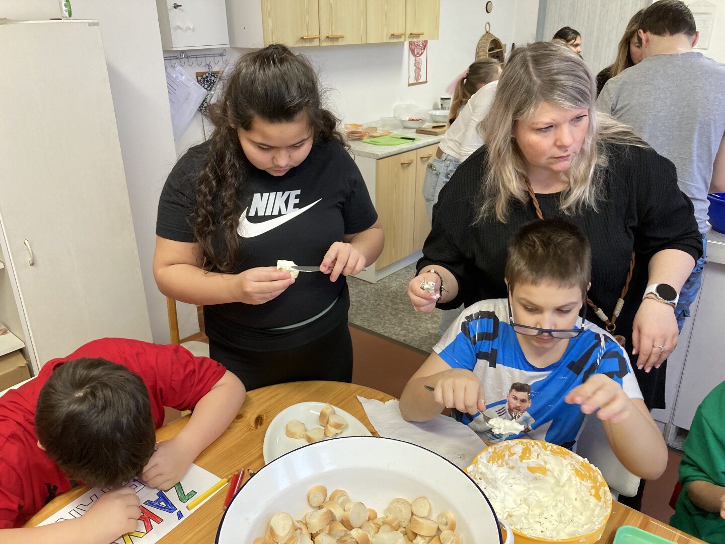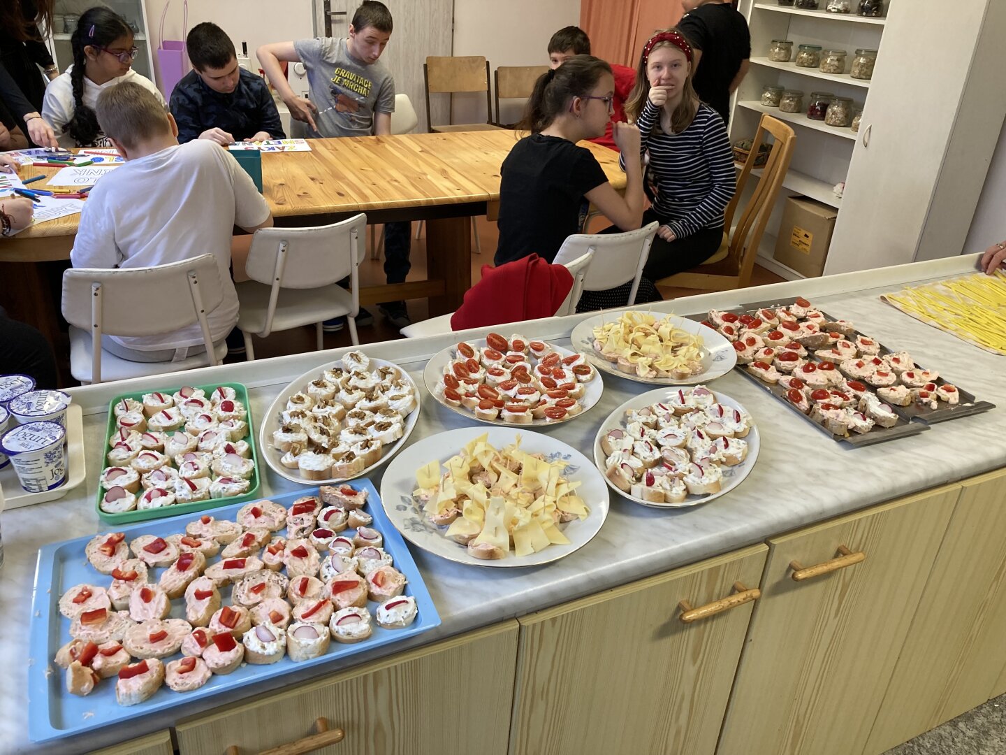 Jakmile byly pomazánky hotové, přišla na řadu ta nejzábavnější část – příprava samotného pohoštění. Žáci pečlivě mazali své výtvory na nakrájená kolečka rohlíků a vytvářeli úhledné jednohubky. Aby výsledek potěšil i oko, nechybělo bohaté zdobení paprikou, ředkvičkami a plátkovým sýrem.