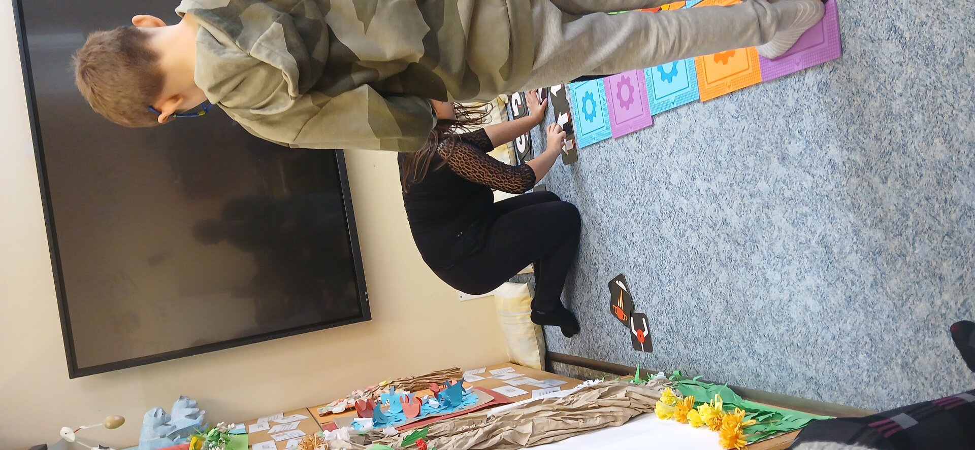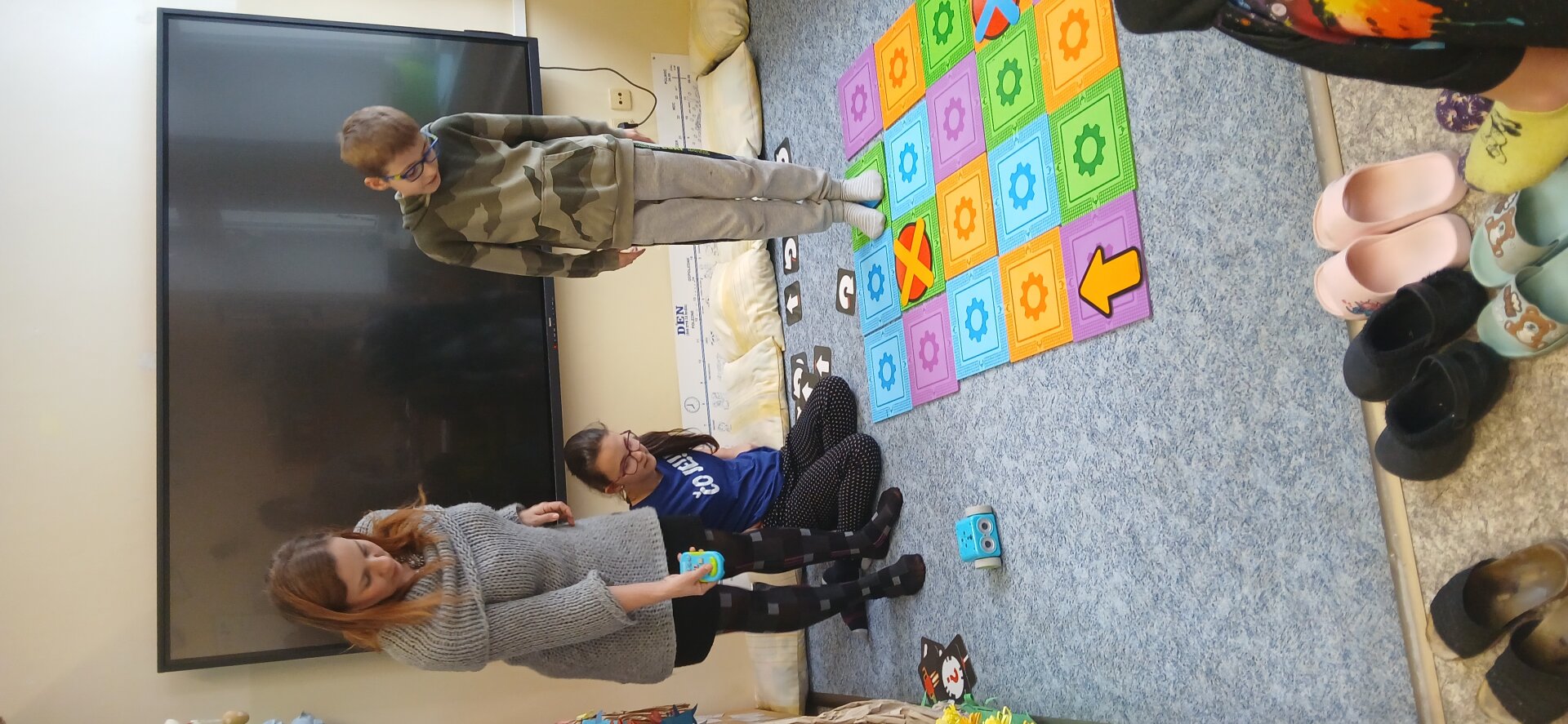 Děti si navzájem programovaly jeden druhého – jeden z dvojice určoval směr a pohyb, druhý se podle pokynů pohyboval po podložce. Zároveň si děti vytvářely vlastní cestičky, po kterých se následně pohybovaly podle vytvořeného „programu“.