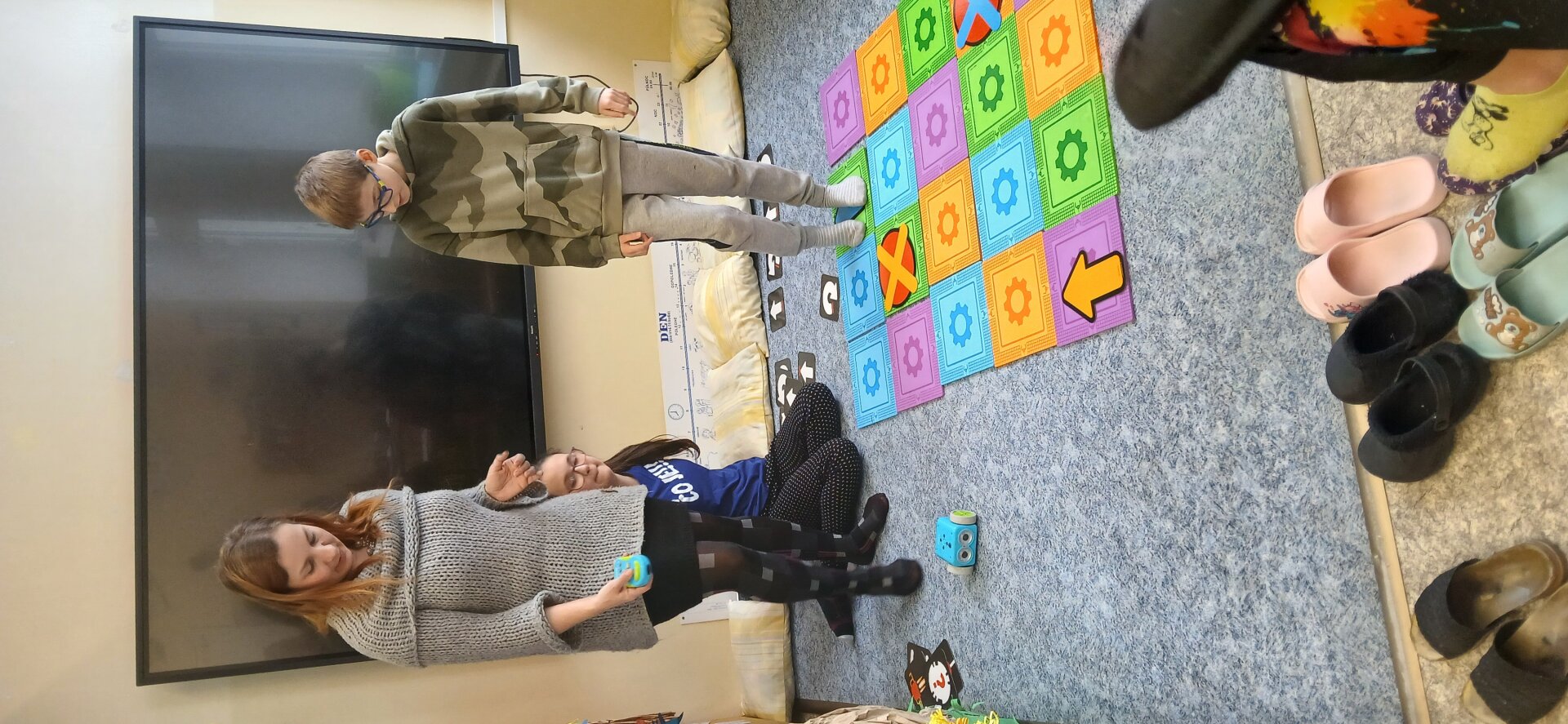 Děti si navzájem programovaly jeden druhého – jeden z dvojice určoval směr a pohyb, druhý se podle pokynů pohyboval po podložce. Zároveň si děti vytvářely vlastní cestičky, po kterých se následně pohybovaly podle vytvořeného „programu“.
