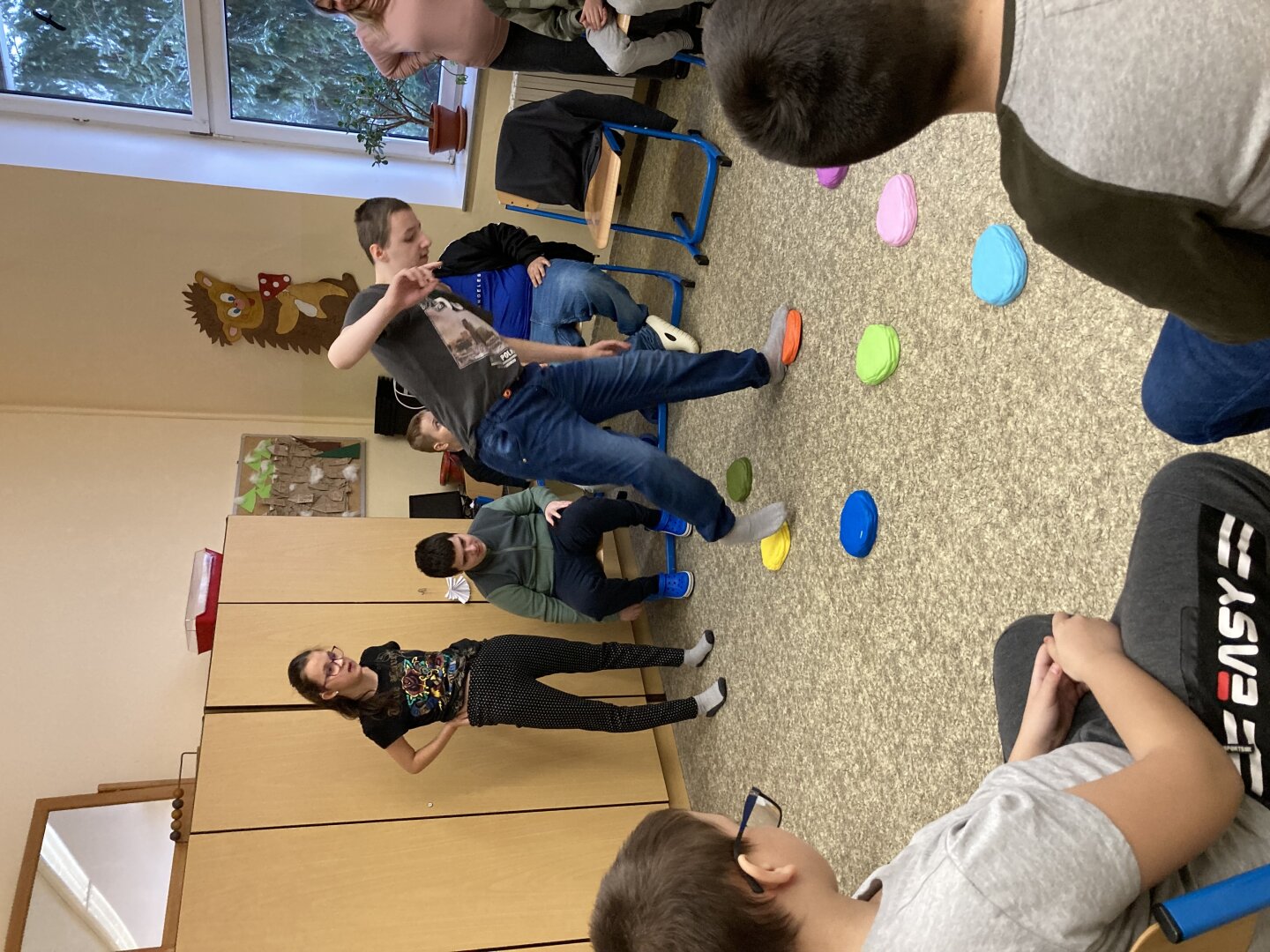První velkou novinkou jsou balanční plastové kameny. Tyto barevné prvky různých velikostí a sklonů okamžitě proměnily podlahu třídy v dobrodružnou stezku. Žáci si na nich procvičili nejen hrubou motoriku a koordinaci, ale také soustředění. Udržet balanc a nespadnout do „pomyslné vody“ mezi kameny byla výzva, kterou všichni zvládli s nadšením.