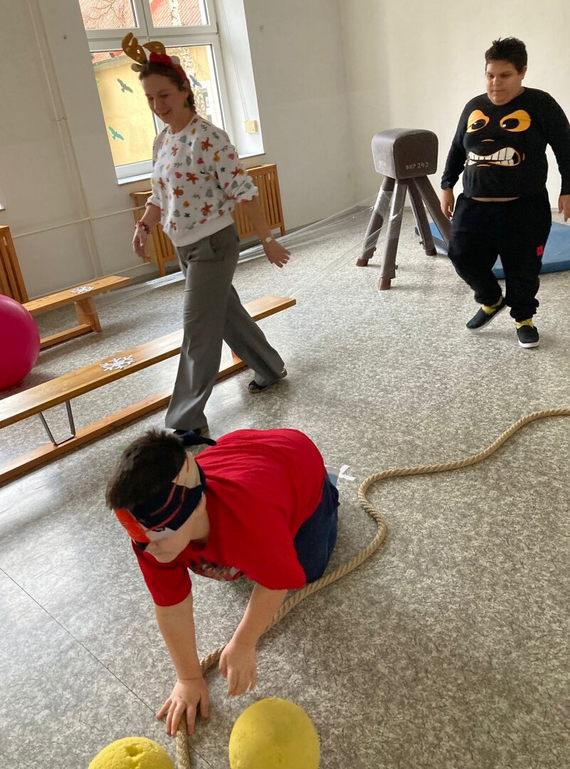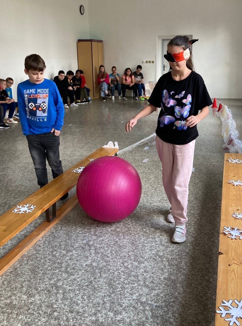 Přestože za oknem bylo počasí téměř jarní, v tělocvičně děti prolézaly kusem ledovce, procházely sněhovou vánicí, musely dávat pozor na lavinu, a dokonce na vše dohlížel i Yetti.