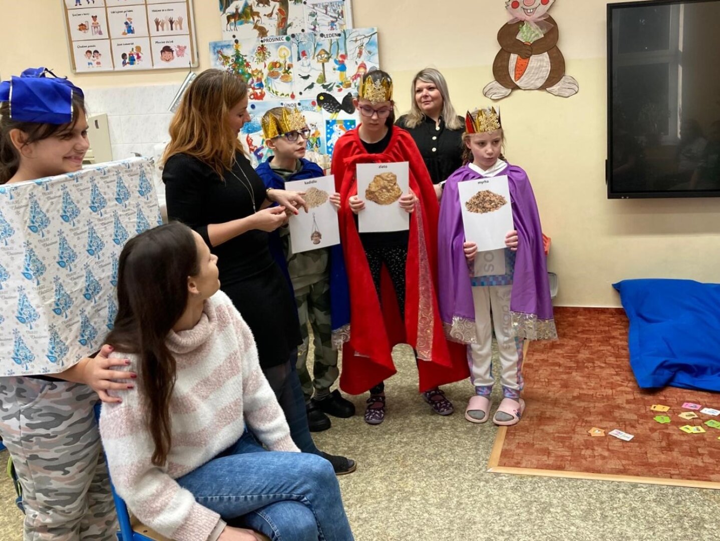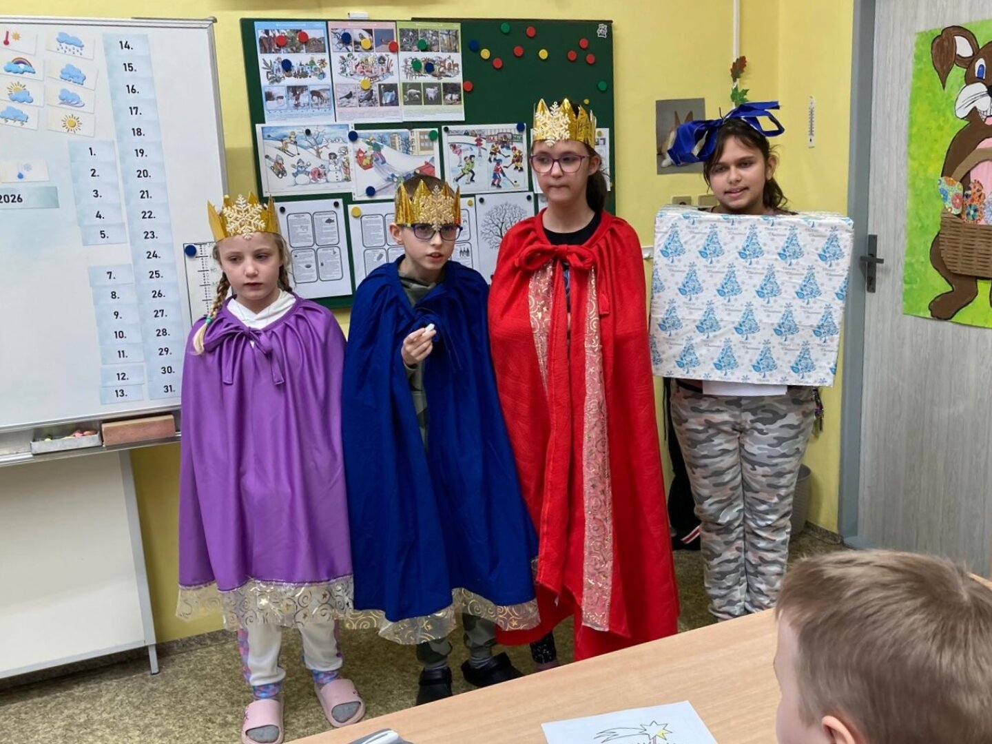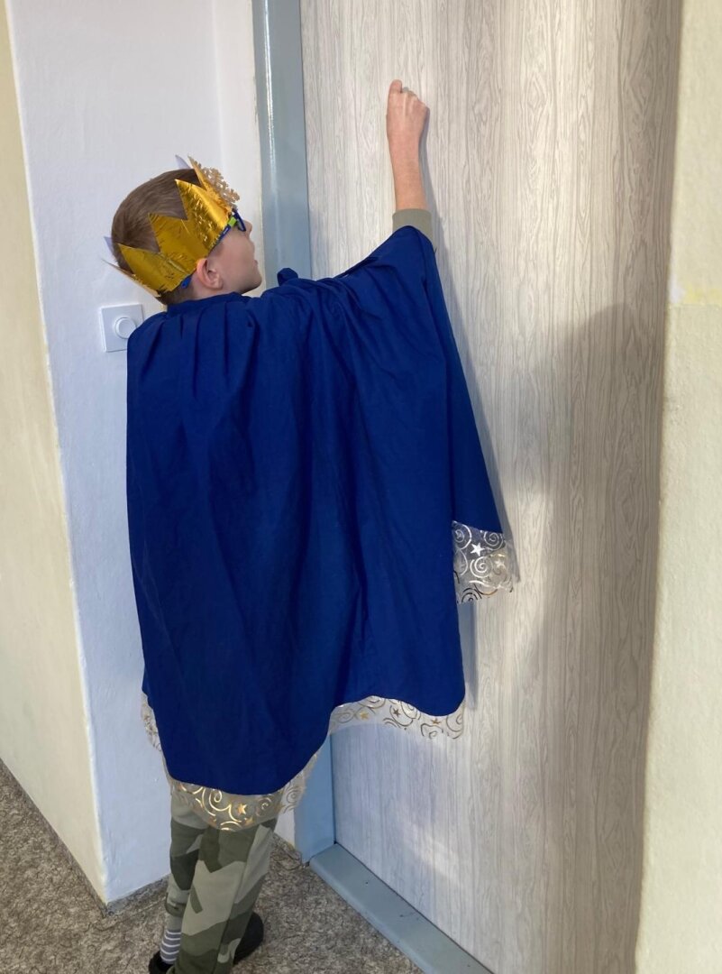 V úterý 6. ledna se naší školou linuly tóny koledy o třech králích, zavítala tam totiž výprava mudrců z Východu. Převlékli se za ně žáci 4. třídy a pro své kamarády z dalších tříd si připravili i spoustu informací. Ti se tak mohli dozvědět například, jak se králové jmenovali, jaké Ježíškovi přinesli dary a třeba i co znamená nápis „K + M + B“. Všichni jsme si toto zpestření dne užili.