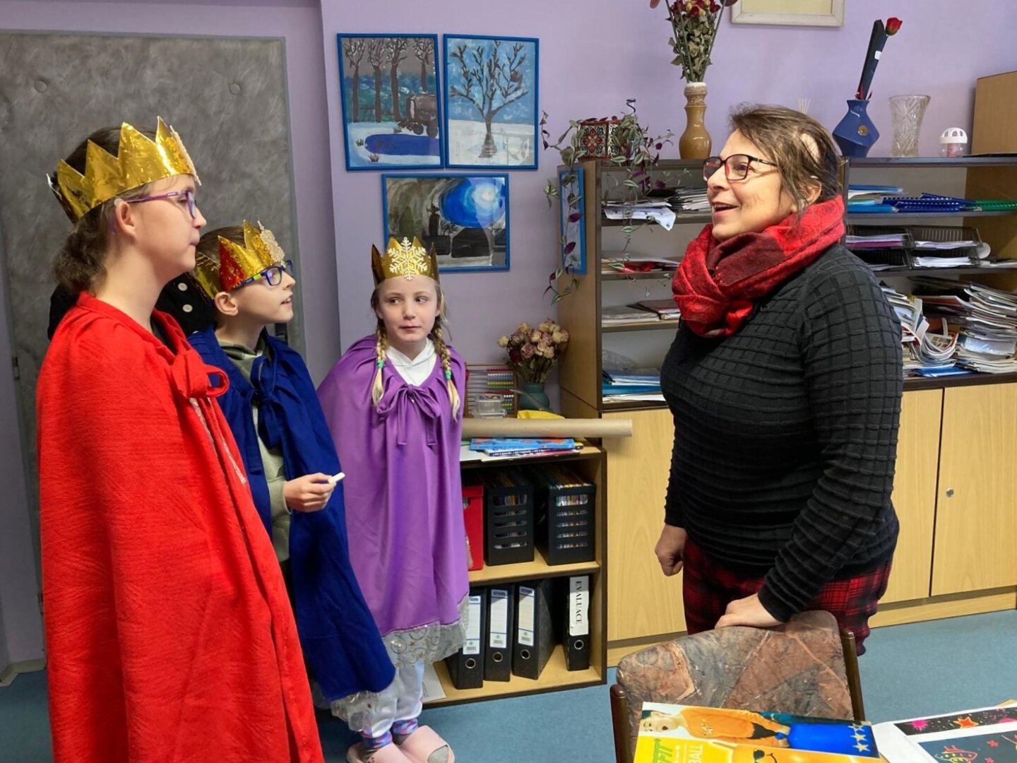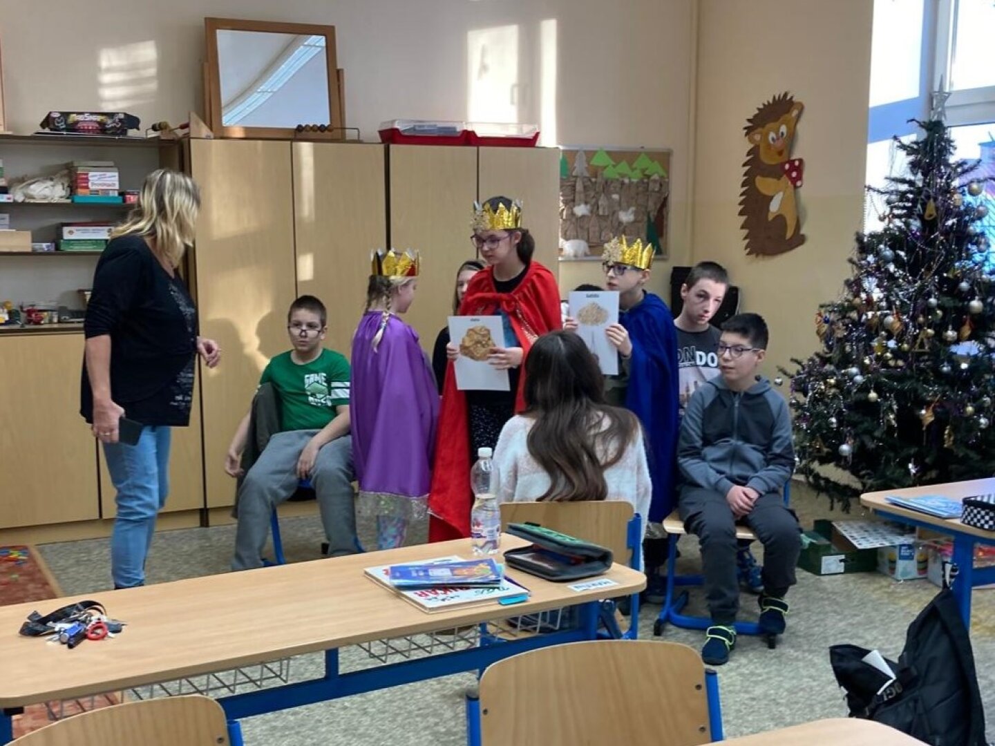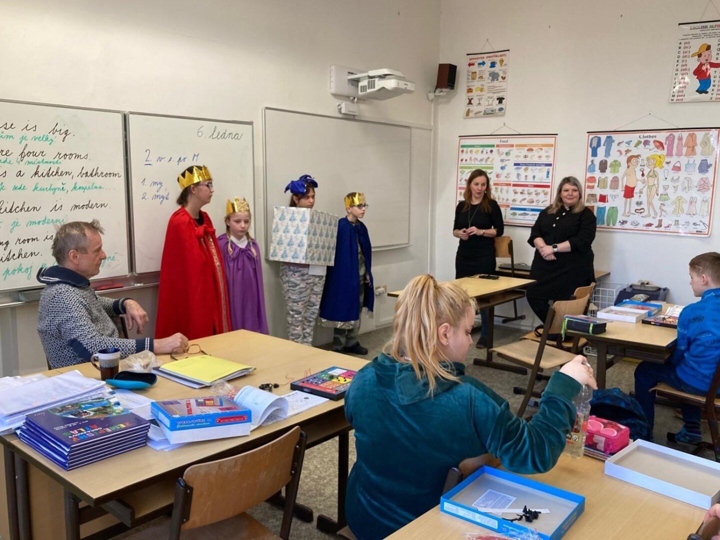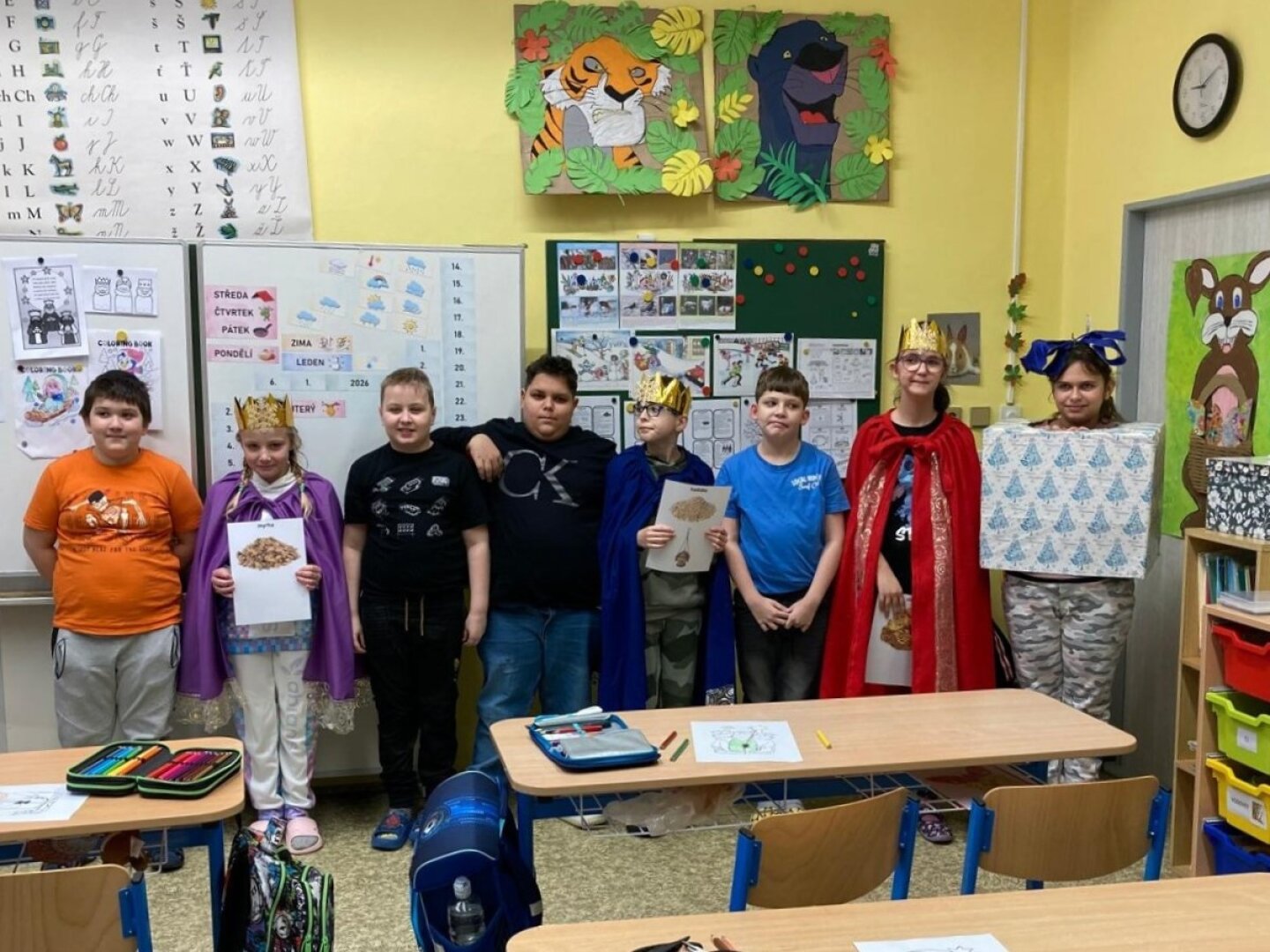 V úterý 6. ledna se naší školou linuly tóny koledy o třech králích, zavítala tam totiž výprava mudrců z Východu. Převlékli se za ně žáci 4. třídy a pro své kamarády z dalších tříd si připravili i spoustu informací. Ti se tak mohli dozvědět například, jak se králové jmenovali, jaké Ježíškovi přinesli dary a třeba i co znamená nápis „K + M + B“. Všichni jsme si toto zpestření dne užili.