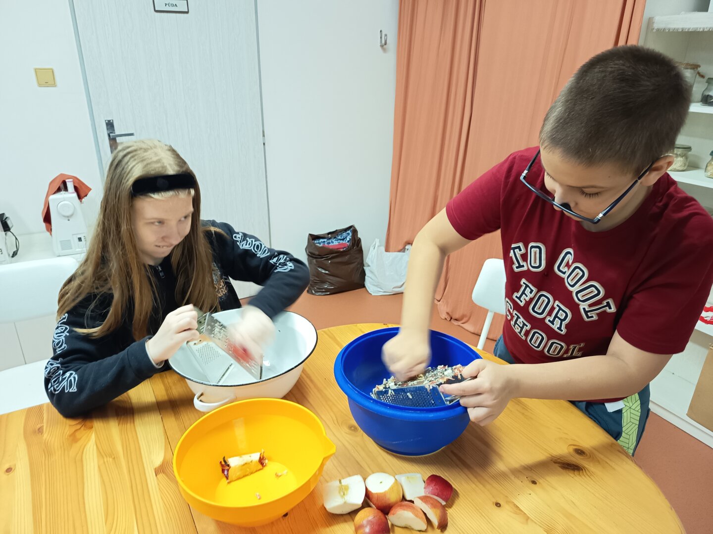 Žáci IV. SP s nadšením přivítali tuto činnost a po rozdělení do jednotlivých pracovních skupin se s elánem pustili do práce. Někdo strouhal jablíčka, druhý válel těsto, další připravovali ostatní ingredience.